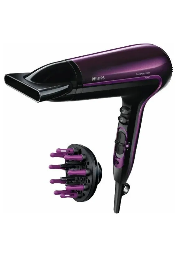Фен Philips HP 8233/00 в стильном фиолетовом цвете — мощный и надёжный прибор для быстрой сушки и бережной укладки волос. Благодаря двигателю мощностью 2200 Вт он создаёт интенсивный поток воздуха, позволяя быстро высушить даже густые и длинные волосы.