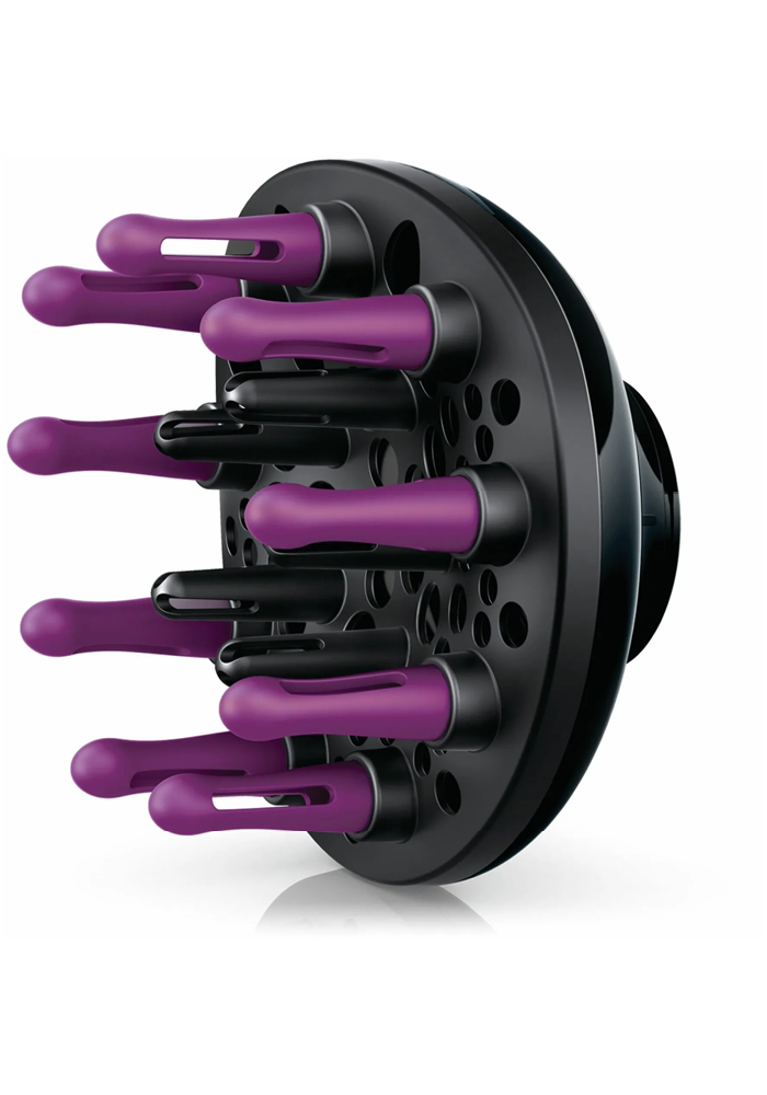 В комплект входят насадка-концентратор для направленного потока воздуха и диффузор, идеально подходящий для придания объёма и работы с кудрявыми волосами.