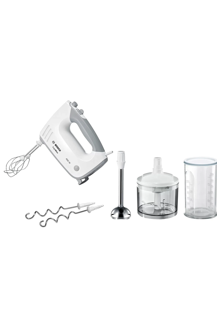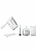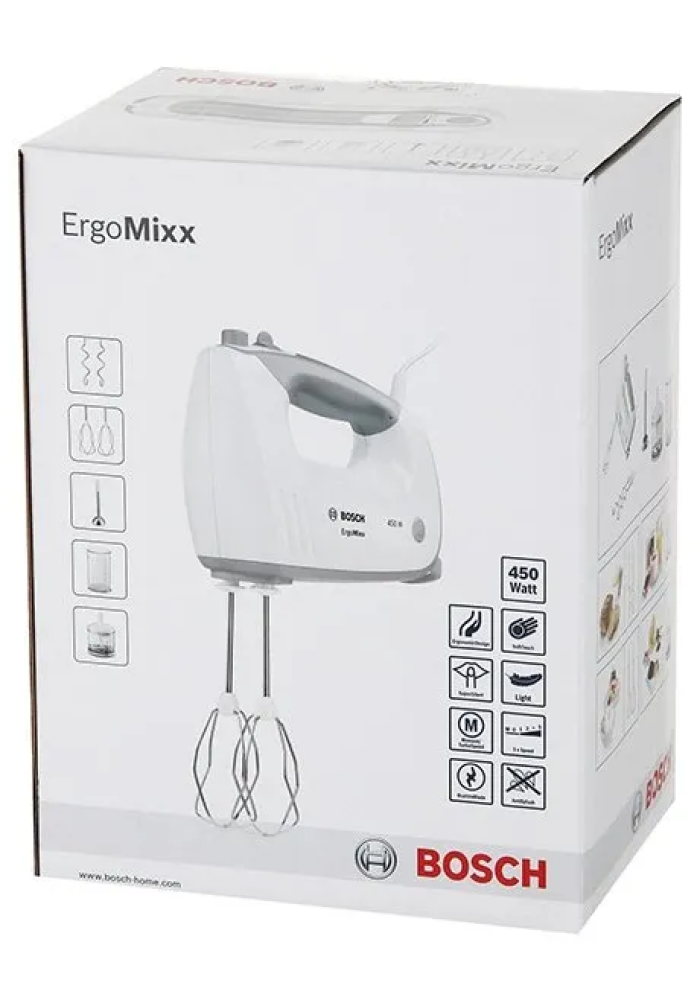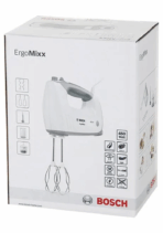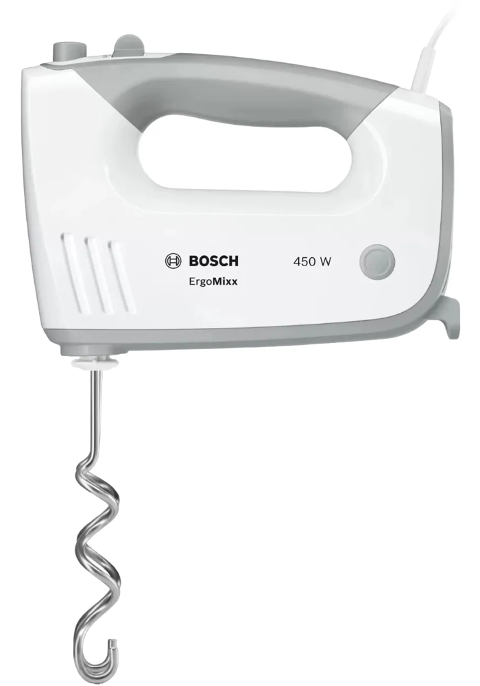 Bosch MFQ36480 — ручной миксер мощностью 450 Вт с 5 скоростями и турборежимом. В комплекте венчики, крюки, блендерная насадка и измельчитель. Универсальное решение для кухни.