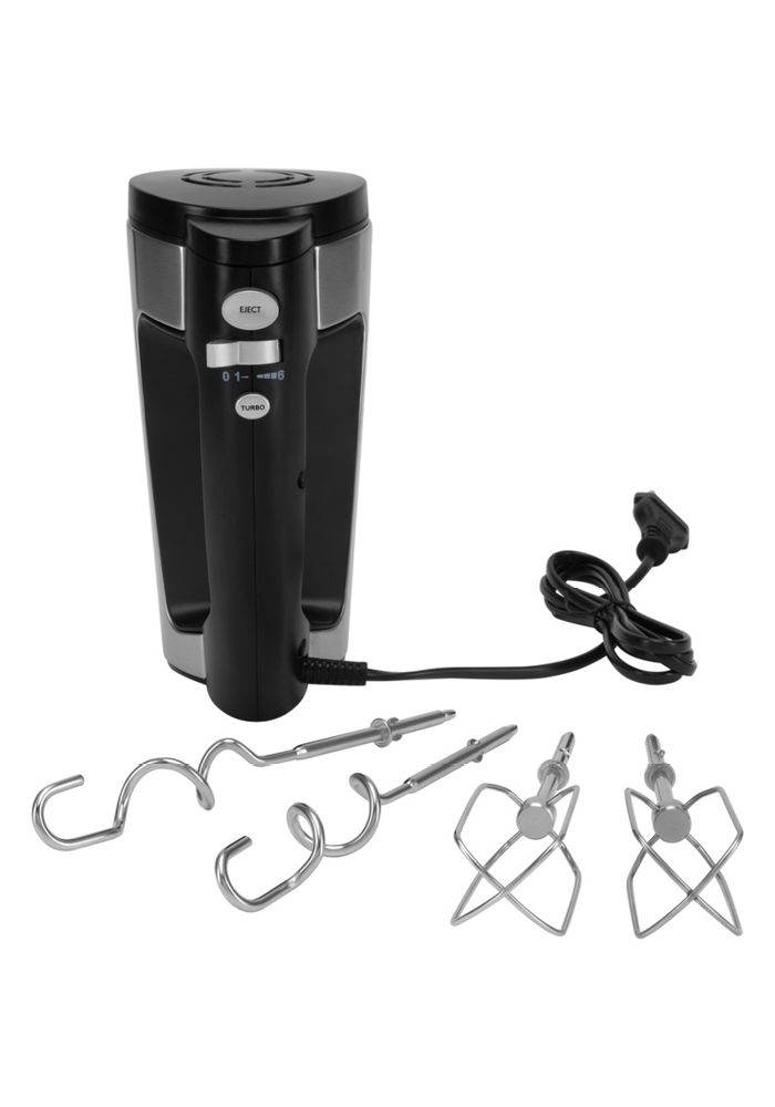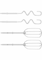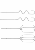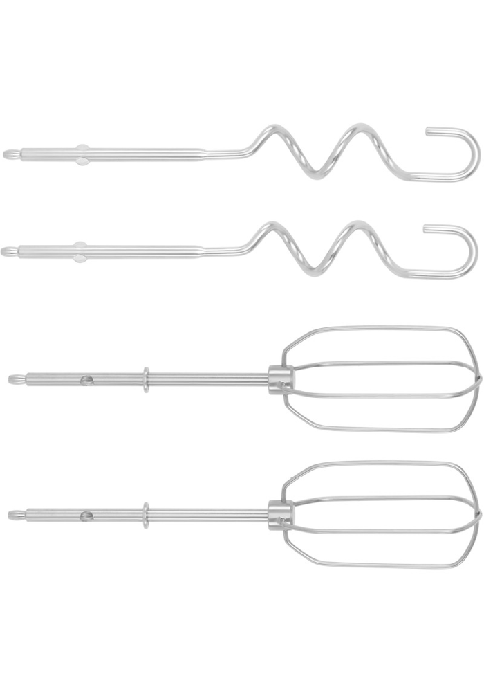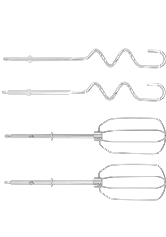 В комплект входят 2 венчика для взбивания и 2 крюка для теста, изготовленные из прочной нержавеющей стали. Насадки легко снимаются и очищаются, что делает использование миксера удобным и практичным.