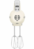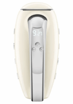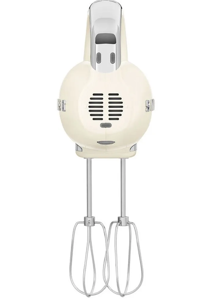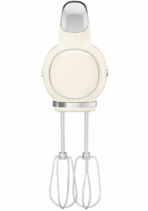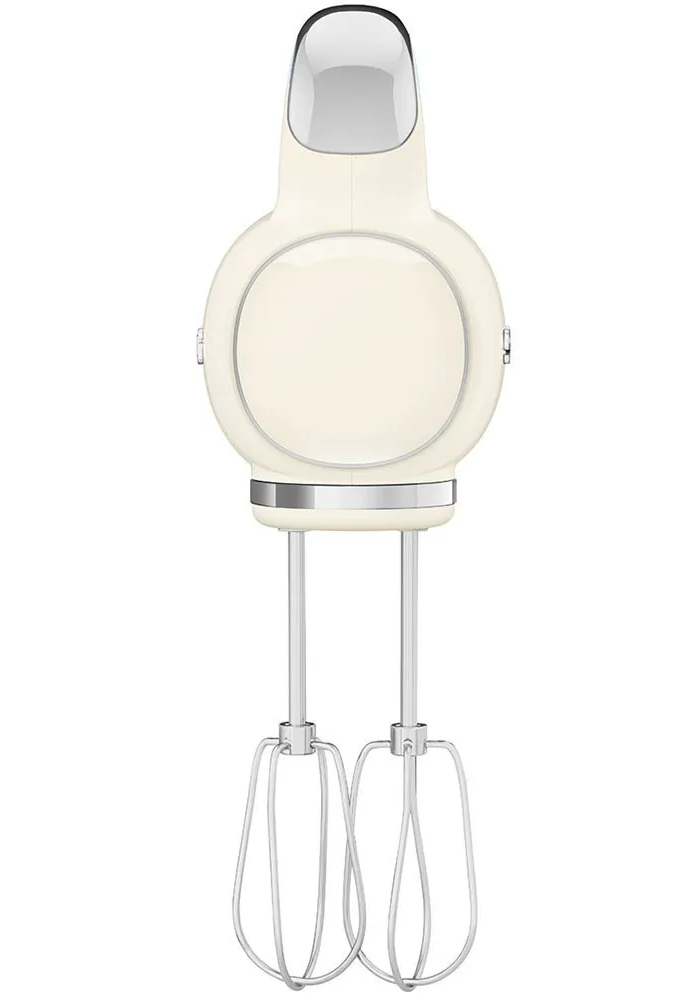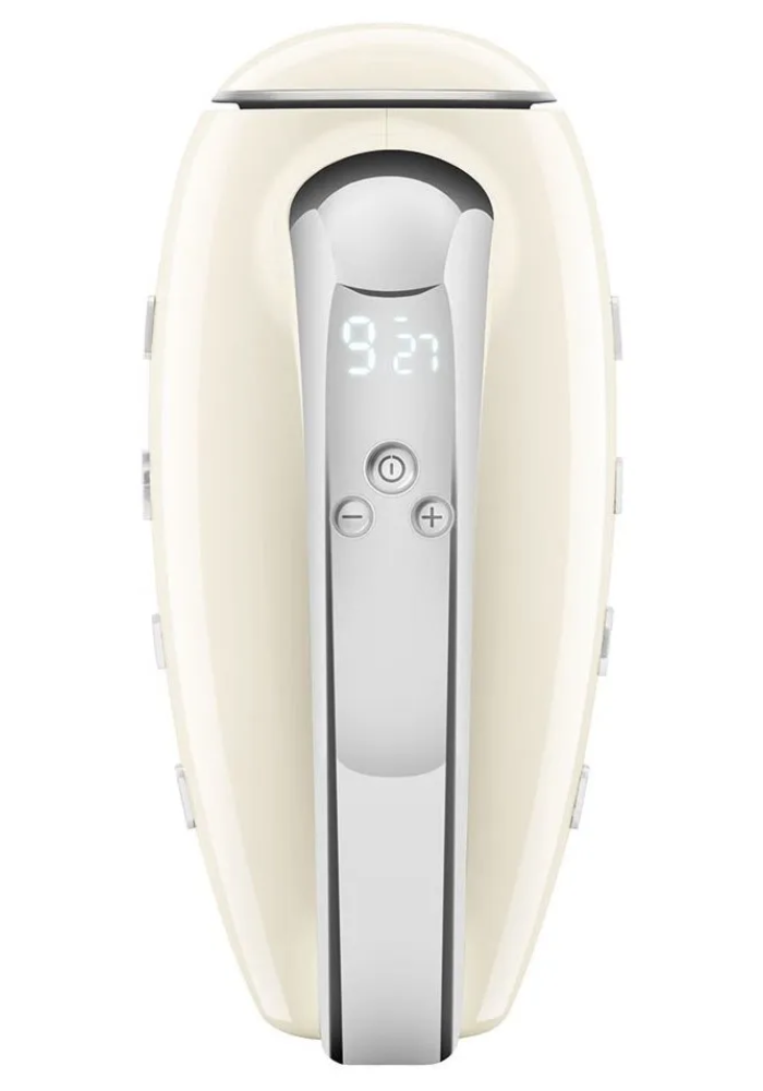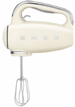 SMEG HMF01CREU — ручной миксер мощностью 250 Вт с 9 скоростями и турборежимом. LED-дисплей, система плавного старта, комплект из 3 пар насадок и фирменный чехол для хранения.